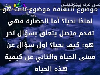 موضوع الثقافة موضوع ثابت هو لماذا نحيا؟ أما الحضارة فهي تقدم متصل يتعلق بسؤال آخر هو: كيف نحيا؟ اول سؤال عن معنى الحياة والثاني عن كيفية هذه الحياة